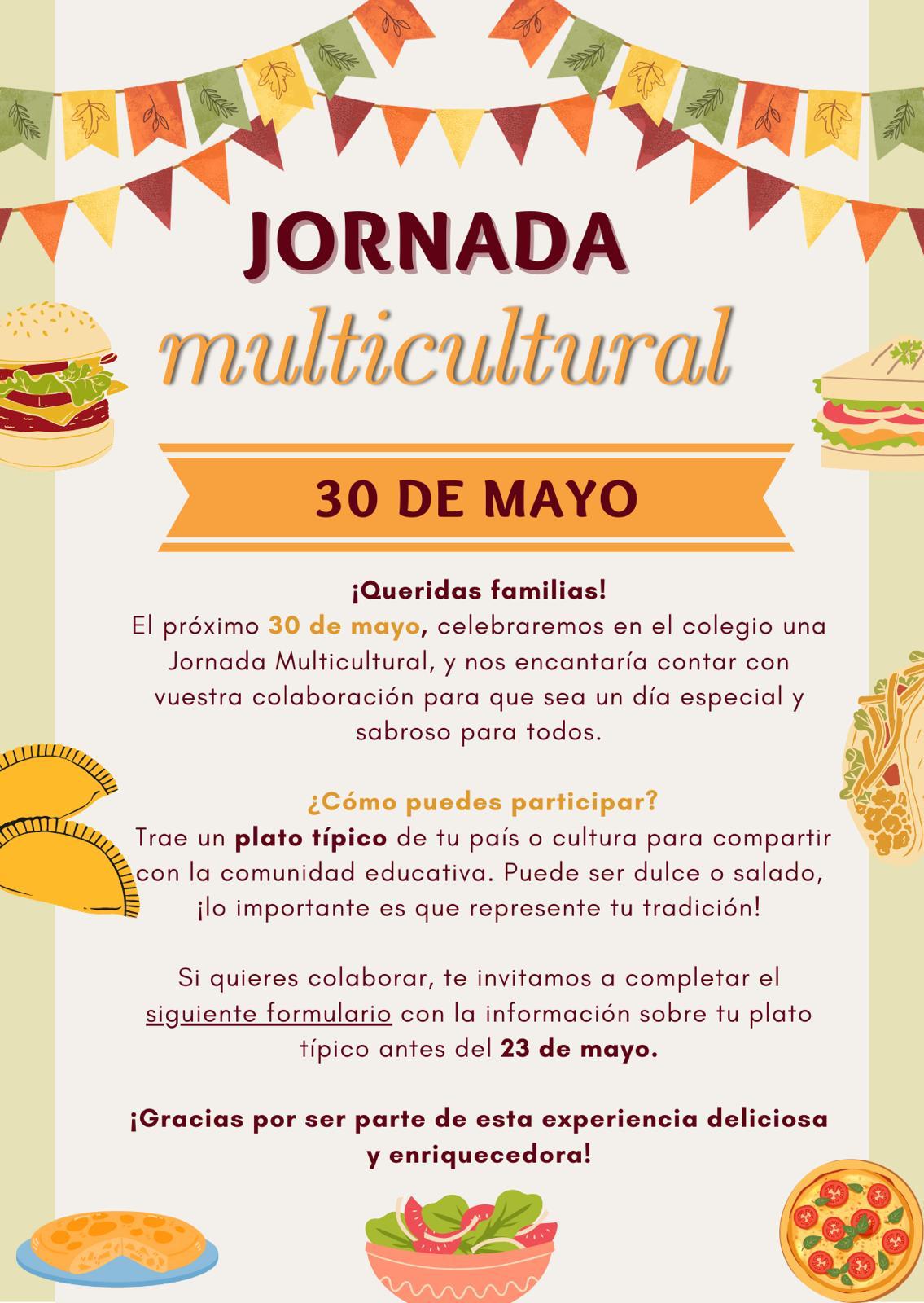 ¡Queridas familias! El próximo 30 de mayo, celebraremos en el colegio una Jornada Multicultural, y nos encantaría contar con vuestra colaboración para que sea un día especial y sabroso para todos. ¿Cómo puedes participar? Trae un plato típico de tu país o cultura para compartir con la comunidad educativa. Puede ser dulce...